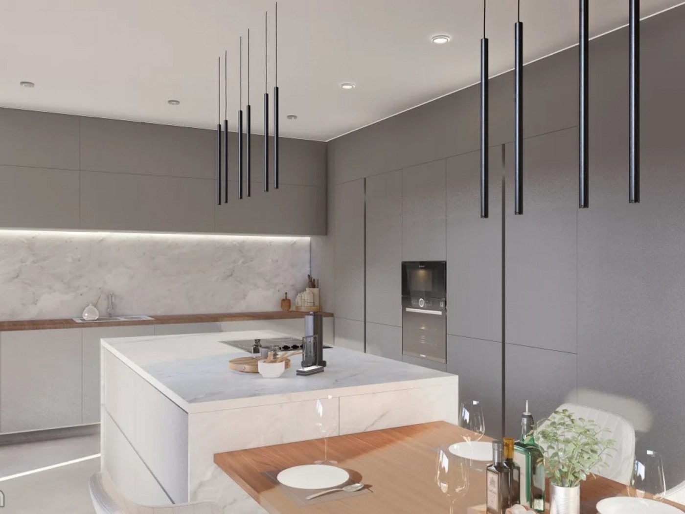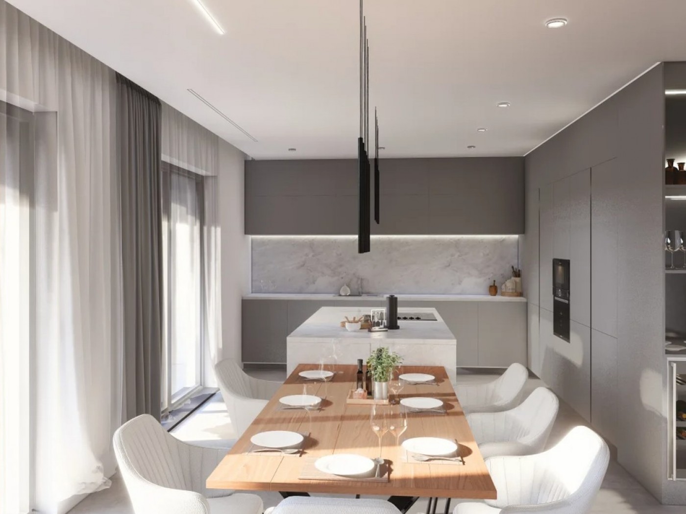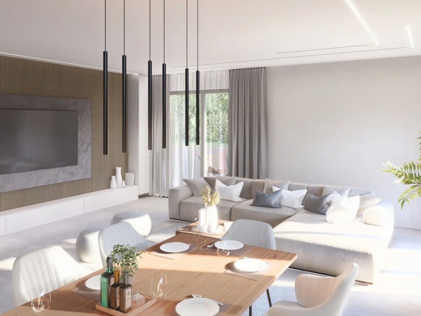 The entrance leads to large open plan living/dining area and integrated kitchen equipped with top of the range appliances, leading to terrace / sunbathing, BBQ area and swimming pool. Still on the ground floor is a Bedroom en-suite and guest Bathroom.